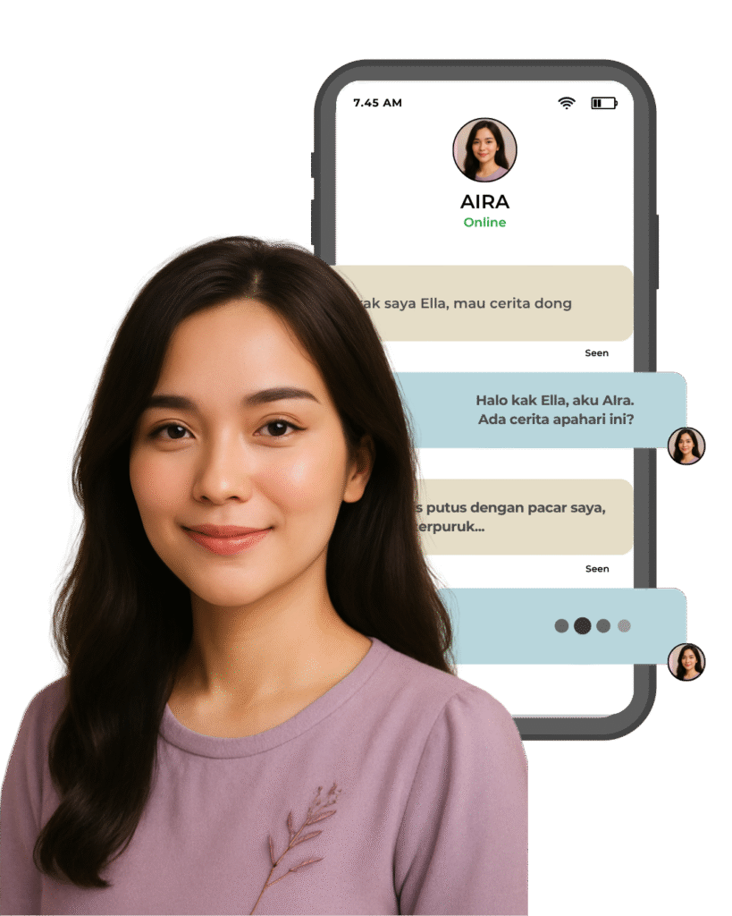 Aira adalah AI teman cerita. Bukan manusia, bukan psikolog, tapi bisa jadi pendengar yang hangat dan aman.